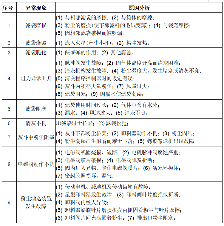 寶雞此處僅列出關(guān)于影響除塵系統(tǒng)正常運(yùn)行的一些常見(jiàn)現(xiàn)象及其原因判斷,具體的各處 元件的故障,詳情請(qǐng)參考其相應(yīng)元件的說(shuō)明書(shū)。