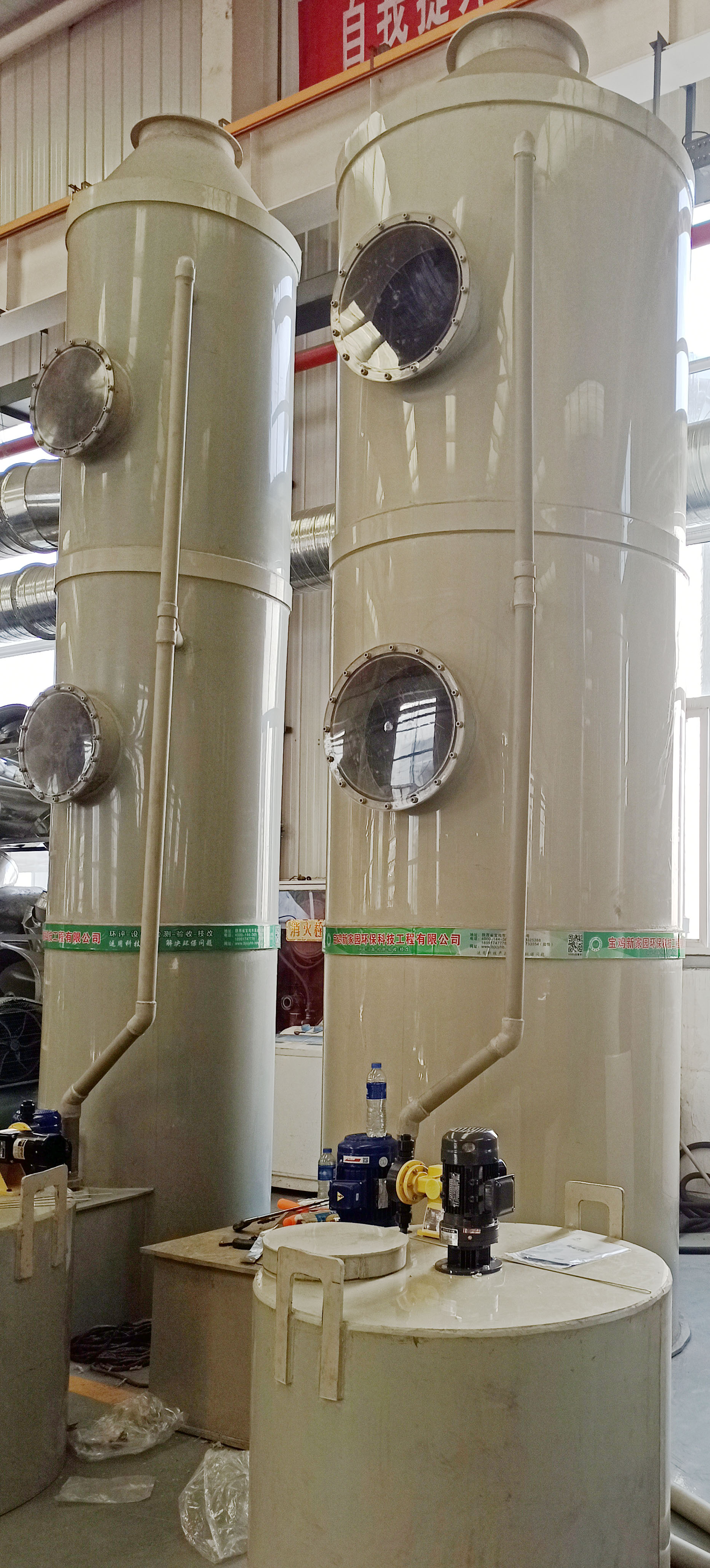 酸堿廢氣凈化處理主要運(yùn)行方式是將酸霧廢氣通過風(fēng)道連續(xù)引入凈化塔,通過填料層,廢氣與氫氧化鈉吸收液進(jìn)行氣化處理。 液體兩相全接觸吸收和中和反應(yīng)。 廢氣經(jīng)凈化后,經(jīng)除霧板脫水除霧,再由風(fēng)機(jī)排入大氣。 吸收液由塔底水泵加壓后從塔頂向下噴淋,然后回流至塔底循環(huán)使用。 凈化后的酸霧廢氣低于國家排放標(biāo)準(zhǔn)。